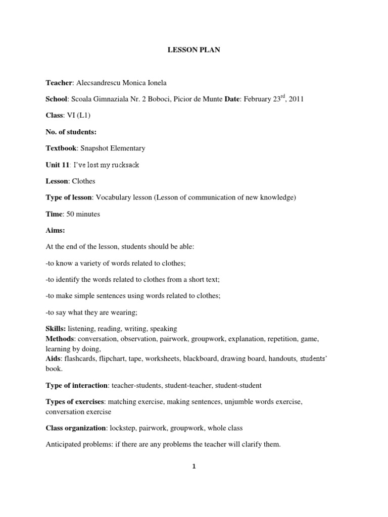 Lesson Plan Clothes Lesson Plan Vocabulary